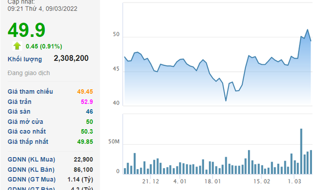 Hiện tại, giá cổ phiếu HPG điều chỉnh nhẹ về mức 49.900 đồng/cp (phiên sáng ngày 9/3), song vẫn tăng 16% trong 1 tháng gần đây.