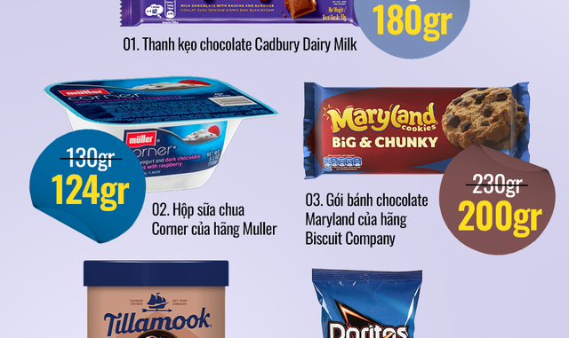 Trên thực tế, rất nhiều món đồ hiện nay từ thỏi chocolate cho đến gói bánh, hộp súp, xúc xích hay nước rửa bát đều bị thay đổi đôi chút về kích cỡ, nhất là trong mảng thực phẩm.