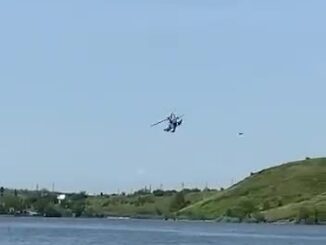 Trực thăng vũ trang Ka-52 Nga bay sát mặt hồ khi hoạt động tại tỉnh Lugansk ở miền đông Ukraine, có thời điểm suýt quét đuôi xuống nước.