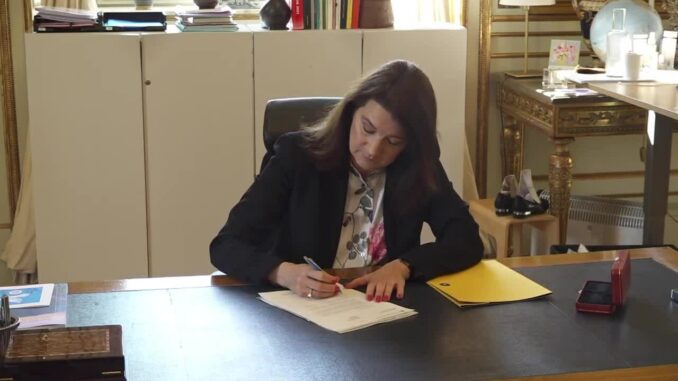 Ngoại trưởng Thụy Điển Ann Linde ký vào đơn xin gia nhập NATO tại Stockhol. Video: YouTube/TV4 Nyheterna
