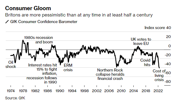 Sau hàng loạt những cú sốc, nền kinh tế Anh đang chứng kiến tốc độ tăng trưởng giảm tốc, lạm phát lên cao cùng vô số những vấn đề nảy sinh chưa được giải quyết khác. Hệ quả là các chỉ số niềm tin người tiêu dùng tại đây giảm mạnh trong khi hàng loạt chuyên gia kinh tế cảnh báo suy thoái.