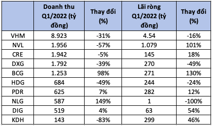 Tương ứng, đa số các doanh nghiệp BĐS đều chứng kiến sự giảm sút cả về doanh thu và lợi nhuận, nguyên nhân một phần do chưa có nhiều dự án mở bán vào quý 1 năm nay.