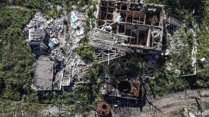 Hình ảnh một ngôi nhà và xe tăng bị phá hủy sau trận pháo kích gần đây ở làng Mala Rohan, tỉnh Kharkov, Ukraine ngày 27/6. Ảnh: Anadolu Agency.