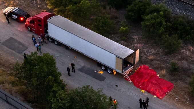 Chiếc xe container 18 bánh chứa thi thể người di cư bị bỏ lại ở phía tây nam thành phố San Antonio hôm 27/6. Một công nhân làm việc gần hiện trường nghe thấy tiếng kêu cứu phát ra từ chiếc xe và đã báo cảnh sát.