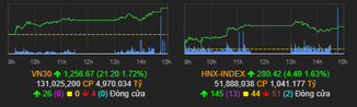 Chốt phiên, VN30-Index tăng hơn 21 điểm với sắc xanh thắng thế hoàn toàn, nhiều mã tăng mạnh trên 5% như HPG, PNJ, SSI.