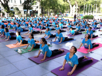 Buổi đồng diễn yoga tại quảng trường tượng đài Lý Thái Tổ được Đại sứ quán Ấn Độ tại Việt Nam tổ chức nhân Ngày Quốc tế Yoga 21/6, với gần 300 người tham gia.