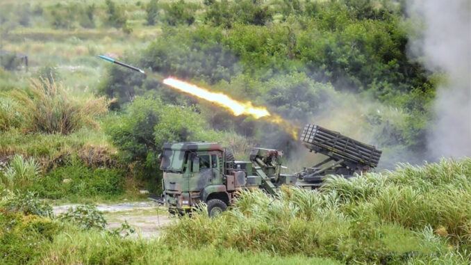 Tổ hợp pháo phản lực Thunderbolt-2000 khai hỏa trong một đợt diễn tập của lực lượng phòng vệ Đài Loan. Ảnh: CNA.