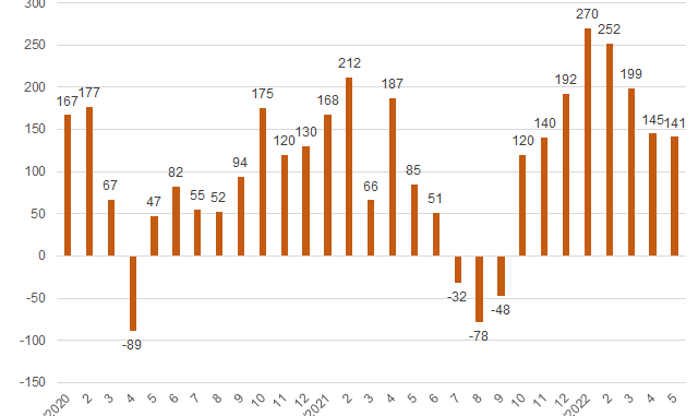 Biên lợi nhuận gộp trung bình tháng 5 đạt 18,2%, tương đương cùng kỳ năm trước; lũy kế 5 tháng giảm từ mức 18,4% xuống 17,8% do tăng trưởng trong doanh thu vàng miếng và thay đổi cơ cấu hàng hóa của kênh bán lẻ.