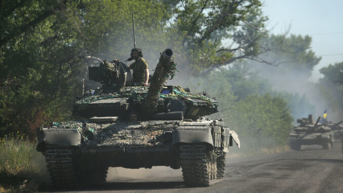 Xe tăng quân đội Ukraine di chuyển trên một con đường ở khu vực Donbass, miền đông Ukraine ngày 21/6. Ảnh: AFP.