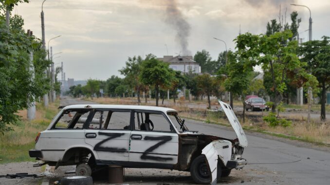 Chiếc ôtô bị hư hại trên đường phố Severodonetsk, miền đông Ukraine, hôm 18/6. Ảnh: AFP.