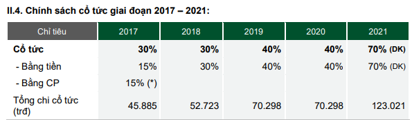 Tại cuộc họp ĐHĐCĐ thường niên 2022, cổ đông thông qua phương án chia cổ tức 2021 tỷ lệ 70% bằng tiền mặt, tương đương tổng chi trả 123 tỷ đồng. Đây là mức chia kỷ lục của doanh nghiệp.
