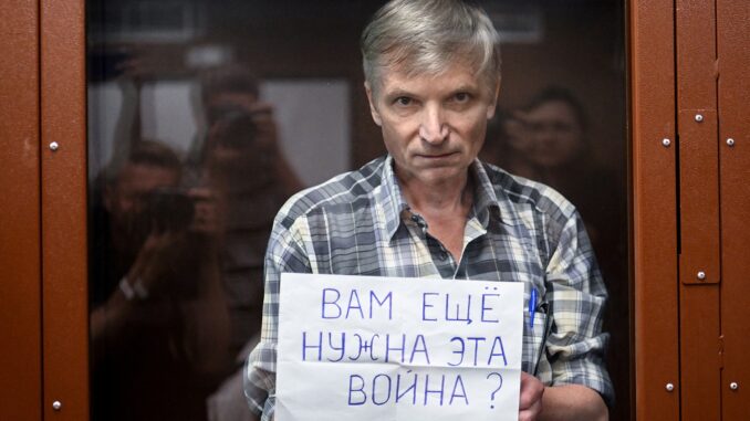 Tòa án Moskva hôm 8/7 kết án Gorinov, 60 tuổi, từng giữ chức ủy viên hội đồng quận Krasnoselsky, vì tội “phát tán thông tin sai sự thật” về quân đội Nga. Trong phiên tòa, Gorinov bị còng tay và giơ tờ giấy có dòng chữ: “Mọi người còn cần cuộc chiến này không?”.