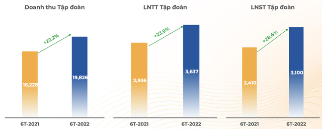 Khấu trừ chi phí, FPT lãi sau thuế 6 tháng 3.100 tỷ đồng, tăng 29% so với thực hiện trong cùng kỳ năm 2021. Trong đó, LNST thuộc về Cổ đông Công ty mẹ tăng 31% lên 2.490 tỷ đồng, Thu nhập trên mỗi cổ phần (EPS) 6 tháng tăng 30% lên 2.279 đồng.