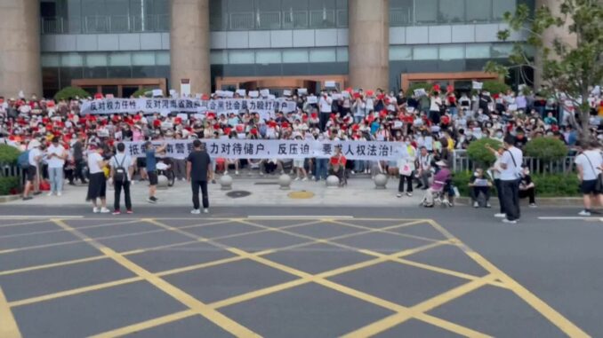 Đám đông sáng 10/7 xếp hàng trước cửa chi nhánh Ngân hàng Nhân dân Trung Quốc tại thành phố Trịnh Châu, tỉnh Hà Nam, miền trung nước này, cầm theo biểu ngữ “Ngân hàng ở Hà Nam, mau trả tiền cho chúng tôi”, “Thủ tướng Lý Khắc Cường, xin hãy điều tra Hà Nam”.