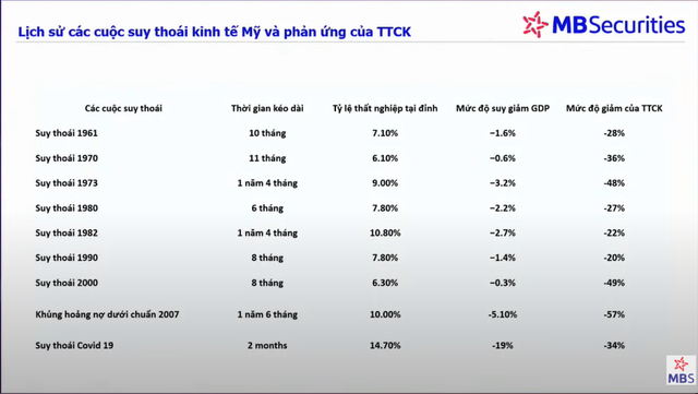Đưa ra thống kê về tác động của những đợt suy thoái kinh tế Mỹ đến thị trường chứng khoán, chuyên gia MBS cho rằng thị trường chứng khoán chỉ giảm mạnh khi nền kinh tế rơi vào khủng hoảng nặng. Còn đối với những đợt suy thoái bình thường, thị trường chứng khoán sẽ có mức giảm nhẹ nhàng hơn, chủ yếu mang tính chất phản ánh đợt suy giảm của nền kinh tế sau khi kết thúc chu kỳ tăng trưởng mạnh mẽ.