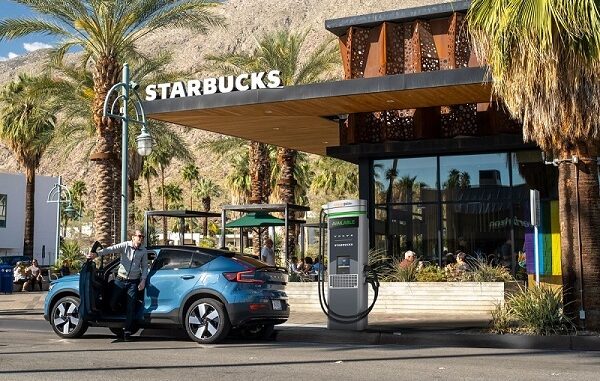 Một trạm sạc xe điện tại cửa hàng cafe ở Mỹ. (Ảnh: Volvo)