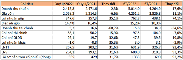 Theo đó, đơn vị ghi nhận lãi sau thuế quý II tăng 31,6% lên 254,1 tỷ đồng. Lãi cơ bản trên cổ phiếu tăng từ 429 đồng lên 565 đồng.