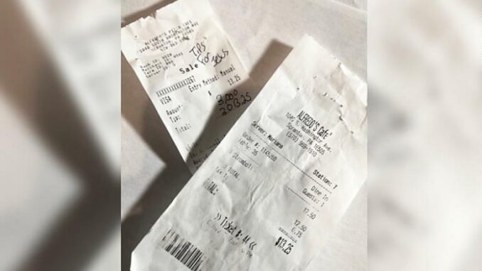 Hóa đơn bữa ăn và khoản tiền tip mà khách hàng Eric Smith để lại nhà hàng Alfredo’s Cafe ở thành phố Scranton, Pennsyslvania tháng trước. Ảnh: CNN.