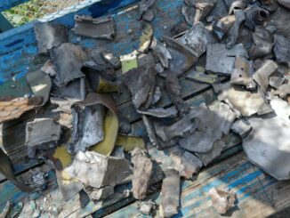 Lực lượng Nga trưng bày các mảnh đạn pháo phản lực HIMARS thu được sau vụ pháo kích làm hàng chục tù binh Ukraine thiệt mạng ở Yelenovka.