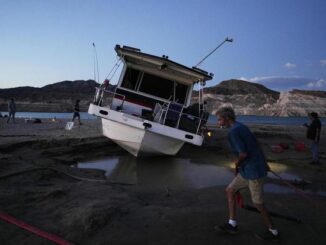 Một chiếc thuyền máy cũ vô chủ nhô lên khỏi lớp bùn đất nứt nẻ như một tấm bia mộ khổng lồ. Văn bia của nó có thể viết: Đây là vùng nước của Hồ Mead.