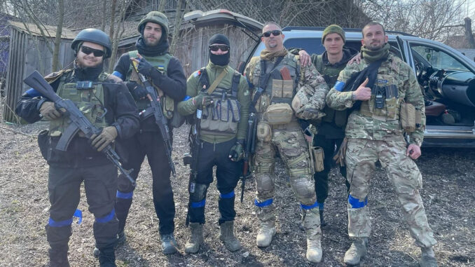Một nhóm lính tình nguyện nước ngoài tham chiến tại Ukraine hồi tháng 3. Ảnh: Twitter/jmvasquez1974.
