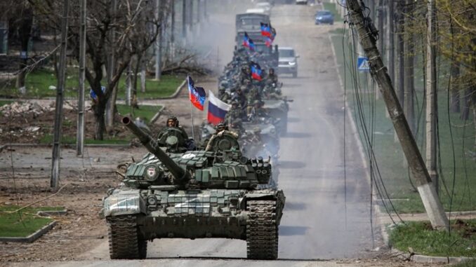 Xe tăng và thiết giáp của lực lượng ly khai thân Nga di chuyển trên đường phố Mariupol, phía đông Ukraine vào giữa tháng 4. Ảnh: Reuters.