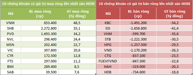 KBC đứng đầu danh sách bán ròng của khối ngoại sàn HoSE với 54 tỷ đồng. SSI và VHM bị bán ròng lần lượt 41 tỷ đồng và 36 tỷ đồng. Ở chiều ngược lại, VNM được mua ròng mạnh nhất sàn này với 48,5 tỷ đồng. SHB và PVD được mua ròng lần lượt 35 tỷ đồng và 34 tỷ đồng.