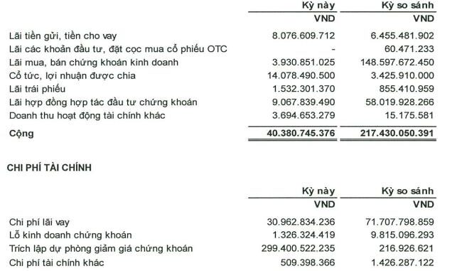 Trong kỳ, lợi nhuận gộp giảm 67,1% so với cùng kỳ, tương ứng giảm 149,25 tỷ đồng, về 73,31 tỷ đồng; doanh thu tài chính giảm 81,4%, tương ứng giảm 177,05 tỷ đồng, về 40,38 tỷ đồng; chi phí tài chính tăng 299,4%, tương ứng tăng thêm 249,03 tỷ đồng, lên 332,2 tỷ đồng; chi phí bán hàng và quản lý doanh nghiệp tăng 49,3%, tương ứng tăng thêm 11,07 tỷ đồng, lên 33,54 tỷ đồng và các hoạt động khác biến động không đáng kể.