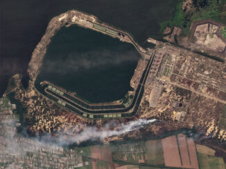 Ba ảnh vệ tinh cho thấy đám cháy ở khu vực phía nam nhà máy điện hạt nhân Zaporizhzhia, cũng như cột bụi từ hố tro phía bắc cơ sở.