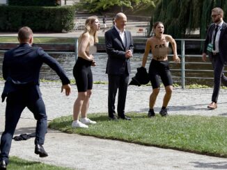 Thủ tướng Đức bối rối khi hai người phụ nữ đứng cạnh bất ngờ cởi áo, để lộ khẩu hiệu cấm khí đốt Nga.