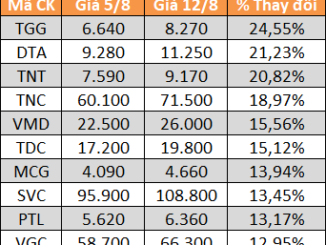 “Tân binh” sàn UPCoM là PDC của Du lịch Dầu khí Phương Đông (UPCoM: PDC) tăng giá mạnh nhất thị trường với gần 62%. Phần lớn các cổ phiếu vốn hóa lớn đều tăng giá trong tuần giao dịch từ 8-12/8.