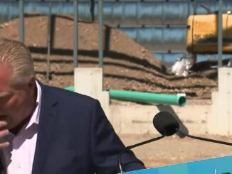 Doug Ford, Thủ hiến tỉnh bang Ontario, vô tình nuốt phải một con ong giữa cuộc họp báo về tương lai hệ thống chăm sóc sức khỏe Canada.