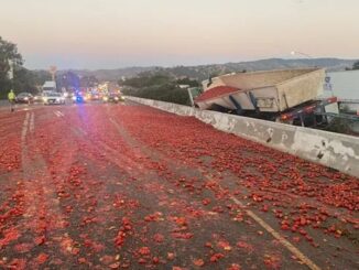 Ba người bị thương, một người bị thương nặng, sau khi xe tải tông vào dải phân cách và làm đổ hơn 150.000 quả cà chua xuống mặt đường.