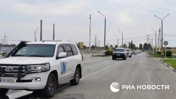 Đoàn xe nhóm chuyên gia IAEA tới nhà máy điện hạt nhân Zaporizhzhia, miền nam Ukraine ngày 1/9. Video: RIA Novosti.