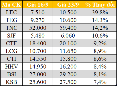 Đứng đầu mức tăng giá ở sàn HoSE là LEC của BĐS Điện lực Miền Trung ( HoSE: LEC ) với gần 40%. Giá cổ phiếu LEC tăng từ 7.510 đồng/cp lên 10.500 đồng/cp. Doanh nghiệp này đã có thông báo tình hình công ty có ảnh hưởng đến biến động giá cổ phiếu. Theo đó, các hoạt động sản xuất kinh doanh vẫn diễn ra bình thường và không có biến động đặc biệt nào trong hoạt động. Việc giá cổ phiếu LEC tăng trần 5 phiên liên tiếp từ 16/9 đến 22/9 là do cung cầu trên thị trường chứng khoán.