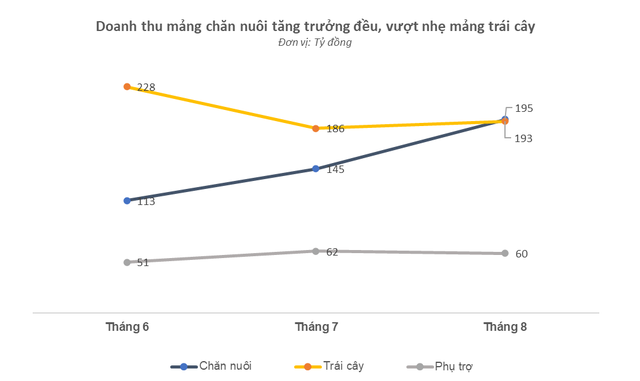 Tương ứng, HAGL đạt 448 tỷ đồng trong tháng 8/2022, trong đó mảng chăn nuôi đem lại 195 tỷ đồng, mảng cây ăn trái đóng góp 193 tỷ và 60 tỷ còn lại là ngành phụ trợ.