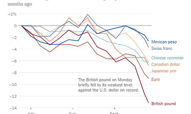 Ở Anh và trên phần lớn lục địa châu Âu, việc đồng USD tăng đang càng thúc đẩy lạm phát. Hôm 26/9, đồng bảng Anh chạm mức thấp kỷ lục so với đồng USD khi các nhà đầu tư chùn bước trước kế hoạch cắt giảm thuế và chi tiêu của chính phủ.