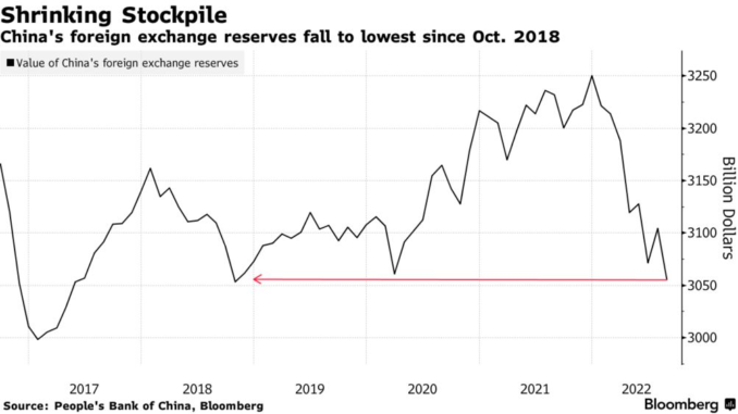 Số liệu mới được công bố từ Ngân hàng Nhân dân Trung Quốc (PBOC) cho thấy, dự trữ ngoại tệ của Trung Quốc giảm xuống còn 3.054,9 tỷ USD tính tới cuối tháng 8/2022, giảm 49,2 tỷ USD so với tháng trước đó. Đây là mức thấp nhất trong 4 năm qua.