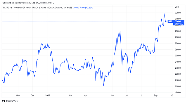 Cổ phiếu NT2 đang giao dịch trong phiên sáng 27/9 quanh mức 30.600 đồng/cp, tăng hơn 52% so với mức đáy 20.100 đồng/cp giữa tháng 5.