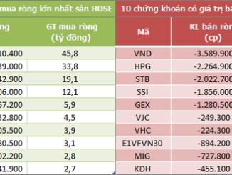 Khối ngoại tiếp tục bán ròng 448 tỷ đồng trên sàn HoSE, tăng 66% so với phiên trước. Đây cũng là phiên bán ròng thứ 7 liên tiếp của khối ngoại sàn HoSE với tổng giá trị 1.750 tỷ đồng. Khối ngoại sàn HoSE bán ròng mạnh nhất mã VND với 75 tỷ đồng.