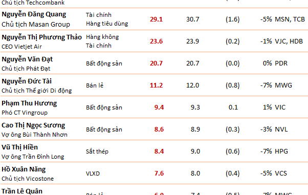Những người khác chứng kiến tài sản giảm trên 1.000 tỷ đồng khác gồm chủ tịch Hòa Phát Trần Long và bộ đôi tỷ phú Nguyễn Đăng Quang – Hồ Hùng Anh.