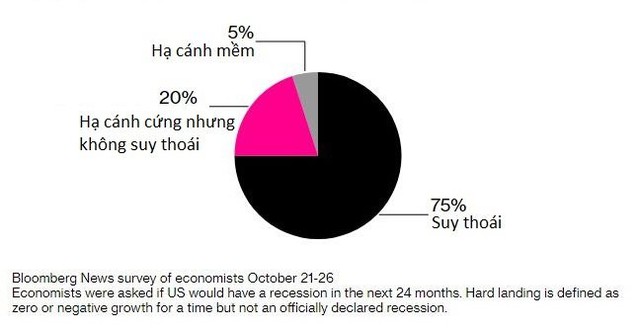 Fed vẫn chưa từ bỏ hi vọng kinh tế Mỹ có thể “hạ cánh mềm”. Tuy nhiên lần đầu tiên trong các cuộc khảo sát trước thềm cuộc họp của FOMC, phần lớn các chuyên gia kinh tế – tới 75% – dự báo suy thoái sẽ xảy ra trong 2 năm tới. Trong khi 25% còn lại dự báo kịch bản hạ cánh cứng với GDP không tăng trưởng hoặc tăng trưởng âm trong thời gian tới.
