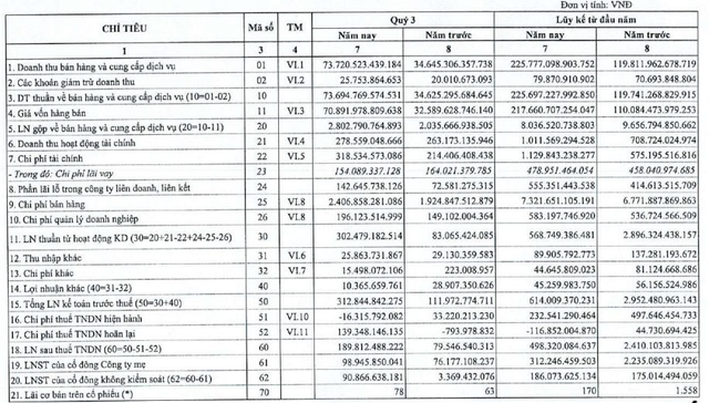Doanh thu tài chính dường như đi ngang so với cùng kỳ, mang lại 279 tỷ đồng. Tuy nhiên chi phí tài chính lại tăng cao 49% lên mức 319 tỷ đồng trong quý 3. Trong đó, chi phí lãi vay 154 tỷ đồng, giảm nhẹ 6% so với quý 3/2021.