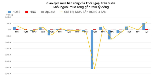 Theo thống kê, khối ngoại có phiên mua ròng trên HOSE với 520,77 tỷ đồng, mua ròng trên HNX với 57,94 tỷ đồng và trên UPCoM mua ròng 8,27 tỷ đồng.