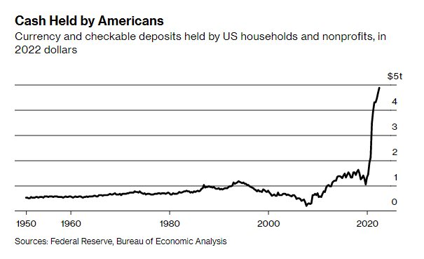 Trên thực tế vào quý IV/2019, trước khi đại dịch bùng phát, các hộ gia đình Mỹ chỉ nắm giữ khoảng 1 nghìn tỷ USD tiền mặt hay các loại tải sản có tính thanh khoản tương đương. Thế nhưng con số này đã nhảy vọt lên 4,7 nghìn tỷ USD trong quý II/2022, điều chưa từng xảy ra trong 70 năm qua.