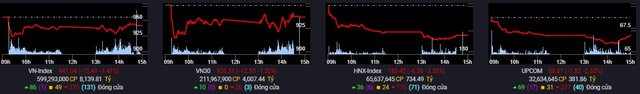 Kết thúc phiên giao dịch, VN-Index giảm 13,49 điểm ( -1 , 41 %) xuống 941 điểm. HNX-Index giảm 6,36 điểm xuống 183 điểm và UPCom-Index giảm 1,82 điểm xuống 66,81 điểm. Thanh khoản trên HOSE đạt giá trị 9 . 448 tỷ đồng.