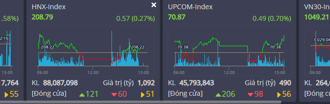 Chứng khoán Việt Nam tiếp tục có thêm một phiên tăng điểm mạnh mẽ. VN-Index đóng cửa tăng 16,26 điểm lên 1.048 điểm. Đây cũng đã là phiên thứ 5 liên tiếp của chỉ số sàn HoSE. HNX-Index tăng 0,56 điểm (+0,27%), lên 208,79 điểm. UPCoM-Index tăng 0,49 điểm (+0,70%), lên 70,87 điểm.