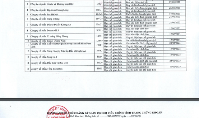 Cũng trong công bố mới nhất của HNX, VSF, LQN và HNM được đưa ra khỏi diện chứng khoán bị hạn chế giao dịch. Thời gian áp dụng từ ngày 17/2 tới.