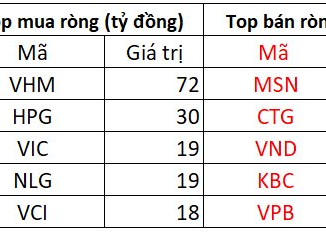 Trên HOSE, khối ngoại mua ròng với giá trị xấp xỉ 96 tỷ đồng, VHM được mua ròng mạnh nhất 72 tỷ đồng.