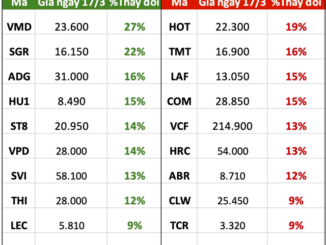 Trên sàn HOSE, top 10 cổ phiếu tăng mạnh nhất tuần qua đều có mức tăng trên 9%.